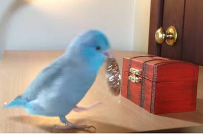貯金箱に大きいコインをいれるインコちゃん|あに丸ズッキーニ